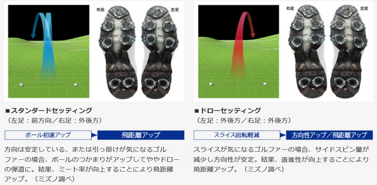 【ゴルフシューズ】IGスパイクのセッティング 飛距離アップと方向安定性を高める2つのセッティング ※①上記は右打ち用の説明です。左打ちの場合は逆にセットしてください。 ②図は片足7個ですが、片足6個の場合も同様にセットしてください。