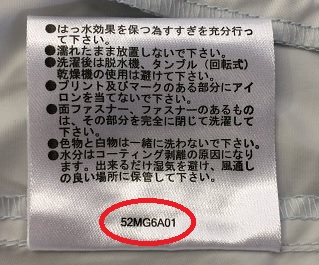 1.まず、対象製品に取り付けている品質ネームを確認してください。8桁の製品品番が印字されています。品質ネームは、ジャケットが左裾内側、パンツが左腰部分裏側、キャップが左側面裏側にそれぞれ縫い付けています。